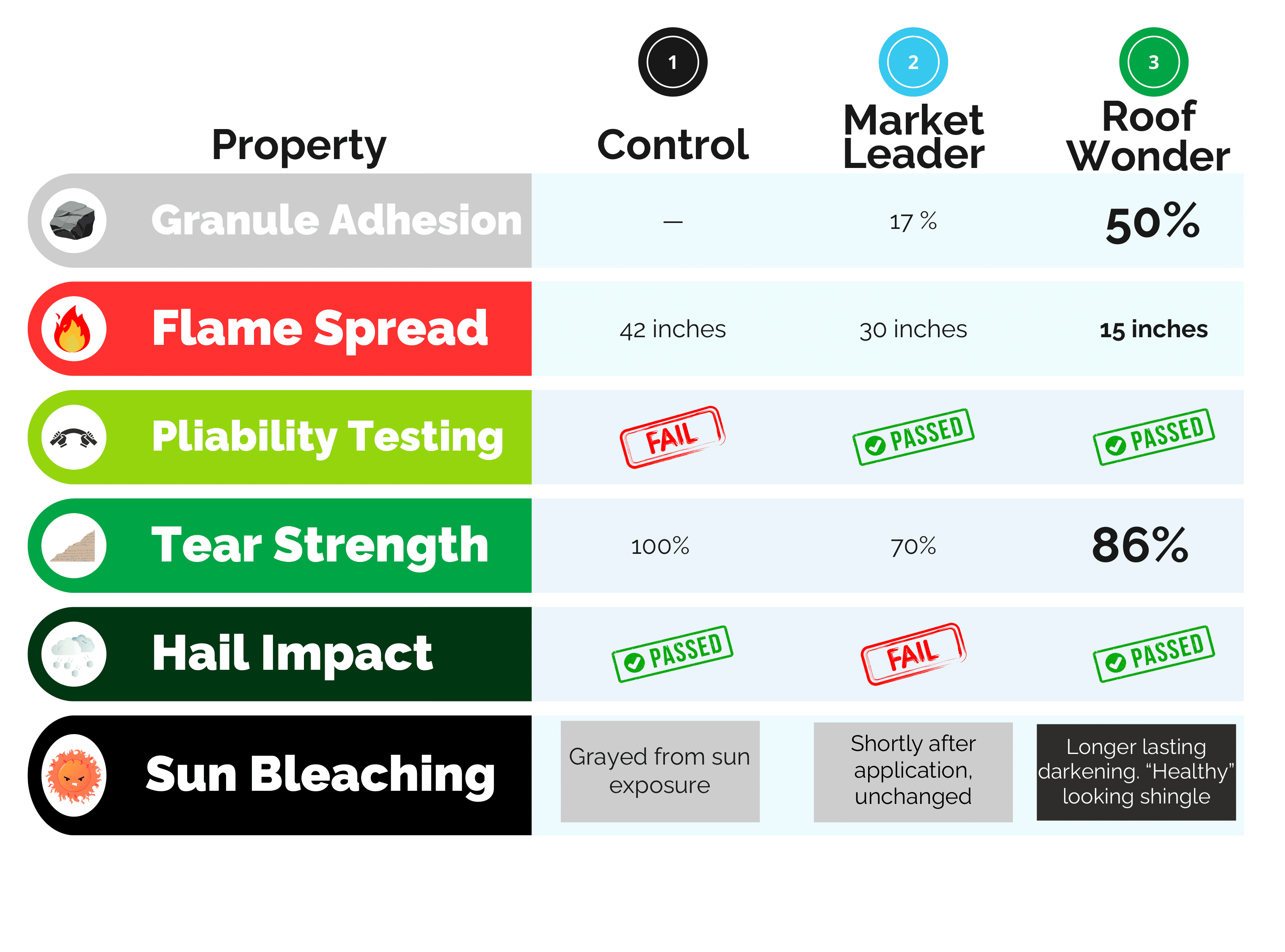 Our solution was tested versus the current market leader in roof rejuvenation solutions and testing produced better results: Pliability, Adhesion, durability to hail and wind and chemical reactivity (molecular absorption).